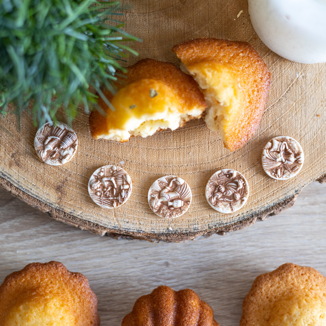 Chaque année, Arnold imagine et réalise la collection de fèves utilisée pour l'emblématique Jeannette des Rois : une boîte de madeleines à la frangipane dont l'une cache une fève.