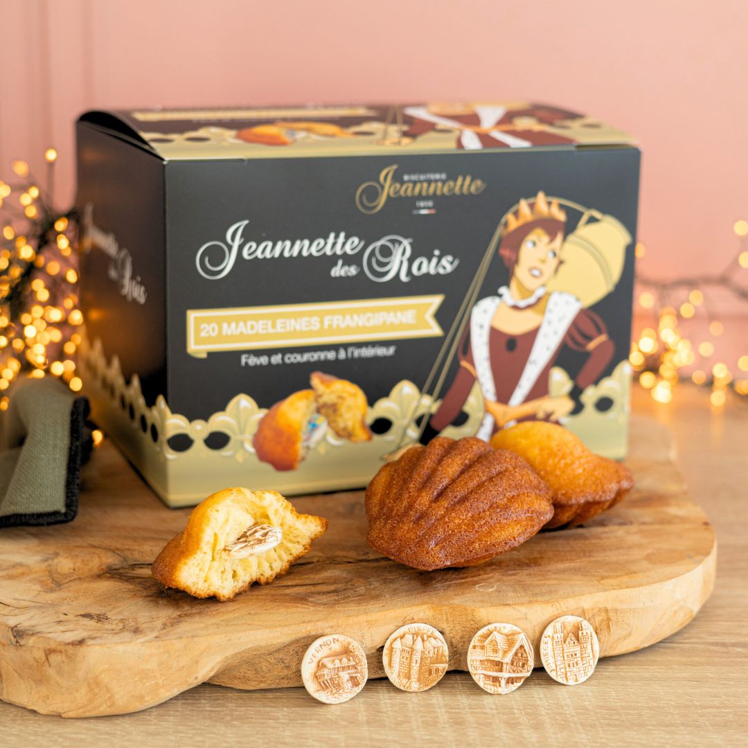 Découvrez la Jeannette des Rois, notre emblématique boîte de Madeleines à la Frangipane. Le petit + : l'une des madeleines cache une fève artisanale normande de notre collection 2026. Comme pour la galette des rois, savourez cette boîte en famille, entre amis ou entre collègues, et laissez le hasard choisir celui ou celle qui portera la couronne !