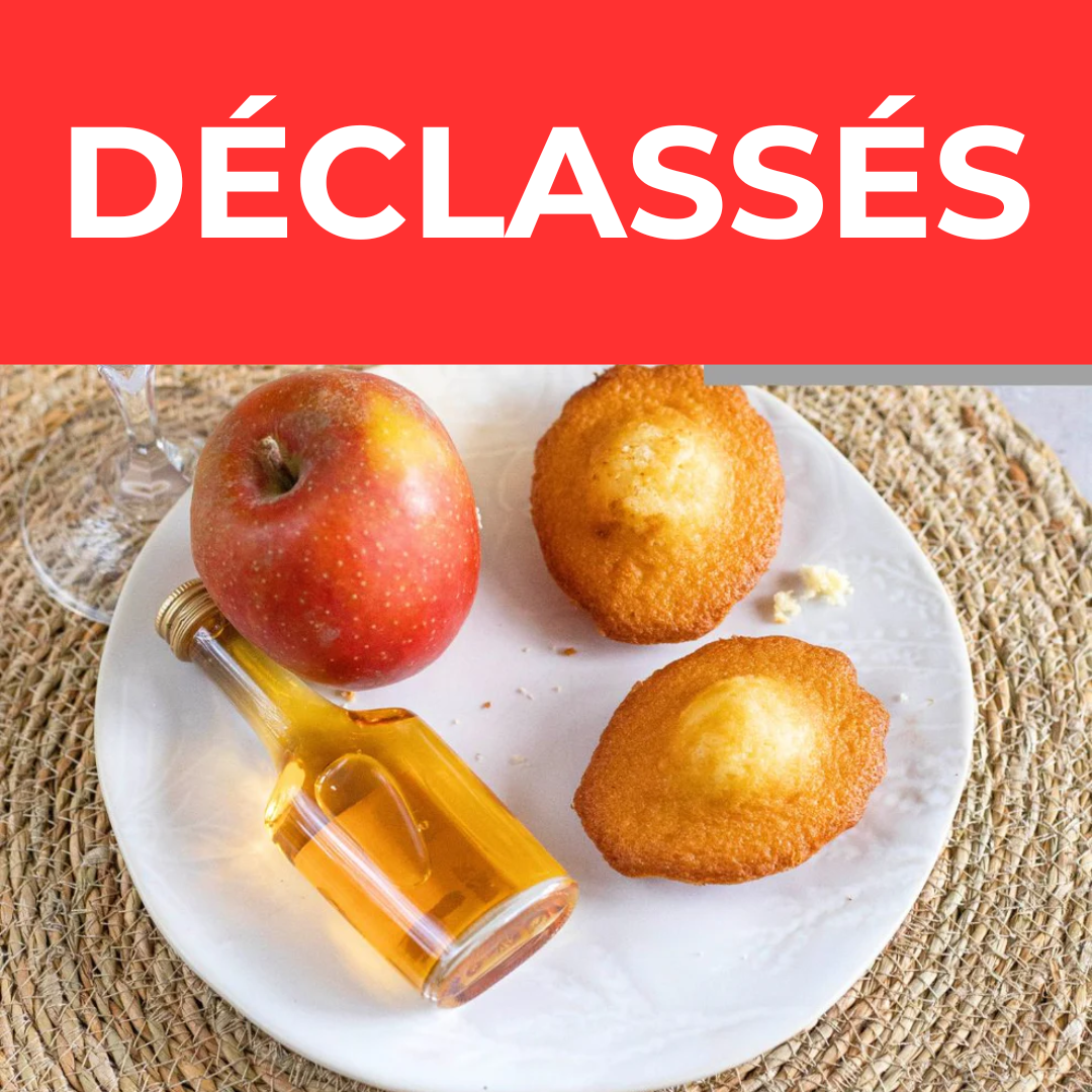 ŒUFS entiers de poules élevées en plein air 23% - farine de BLÉ (origine France) - BEURRE d'Isigny AOP 20% - sucre - calvados 7% - stabilisant : sorbitol - sirop de glucose - poudres à lever : diphosphates, carbonates de sodium (BLÉ) - alcoolat de pomme 1% - sel.